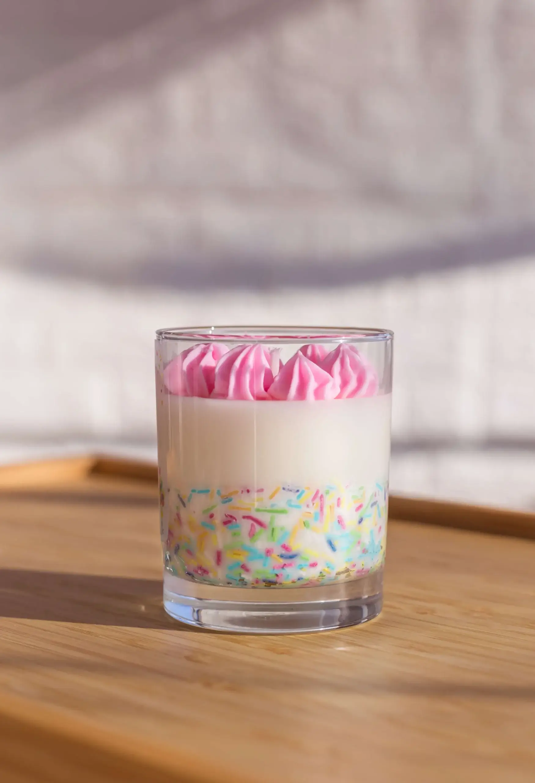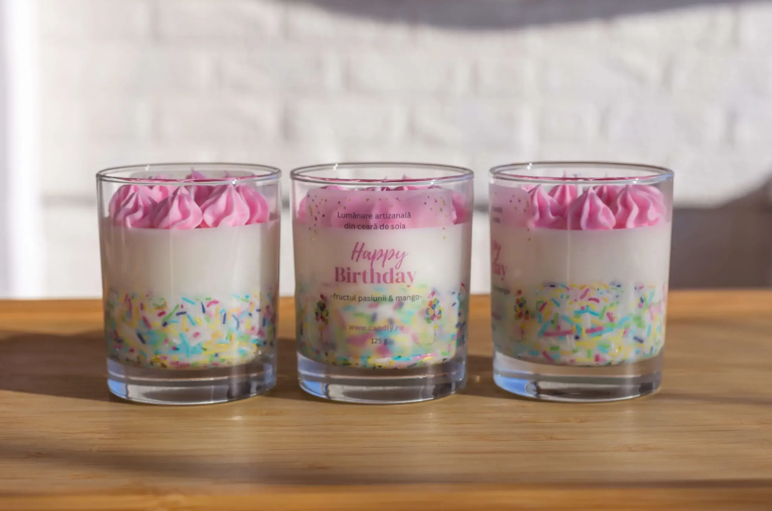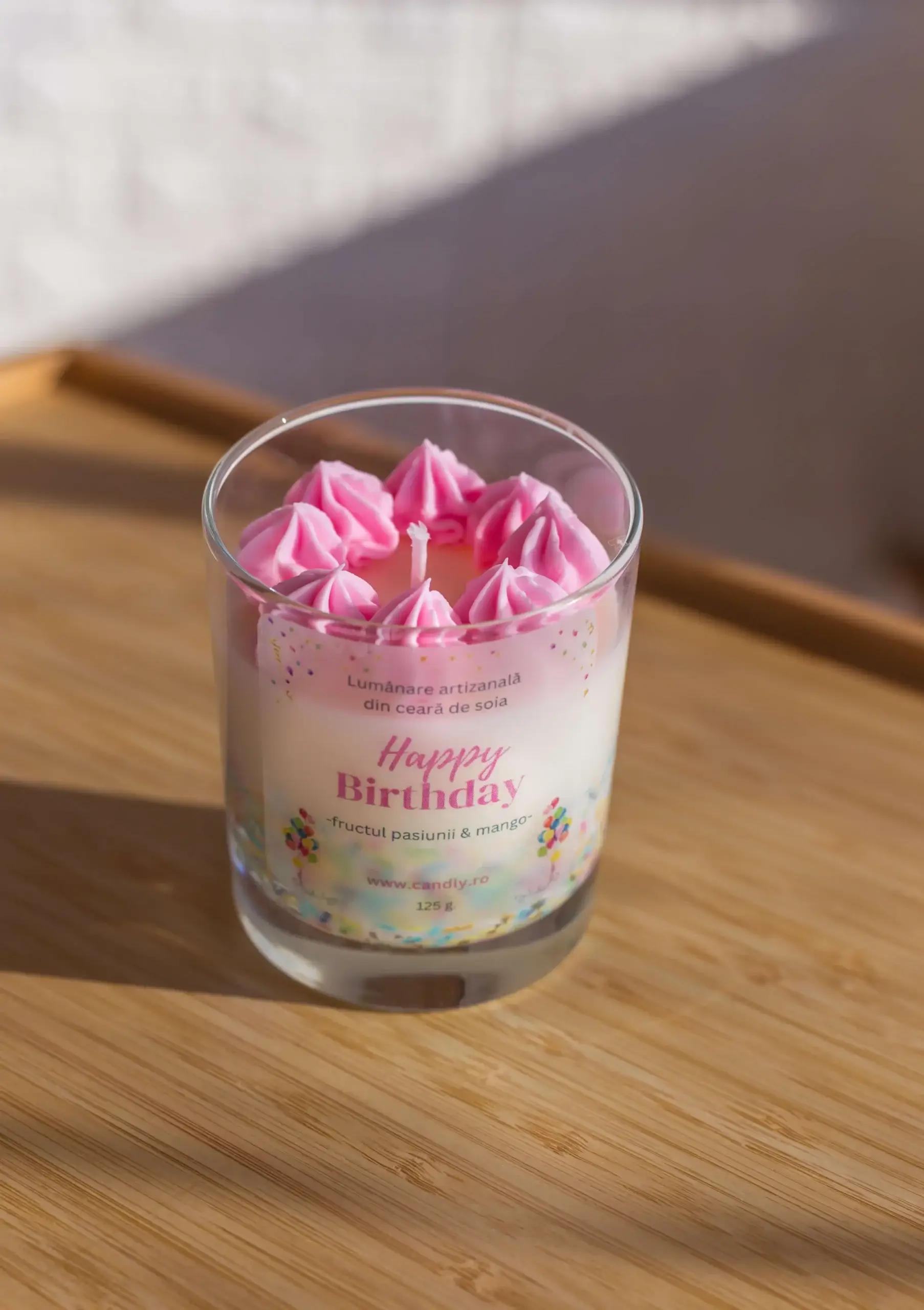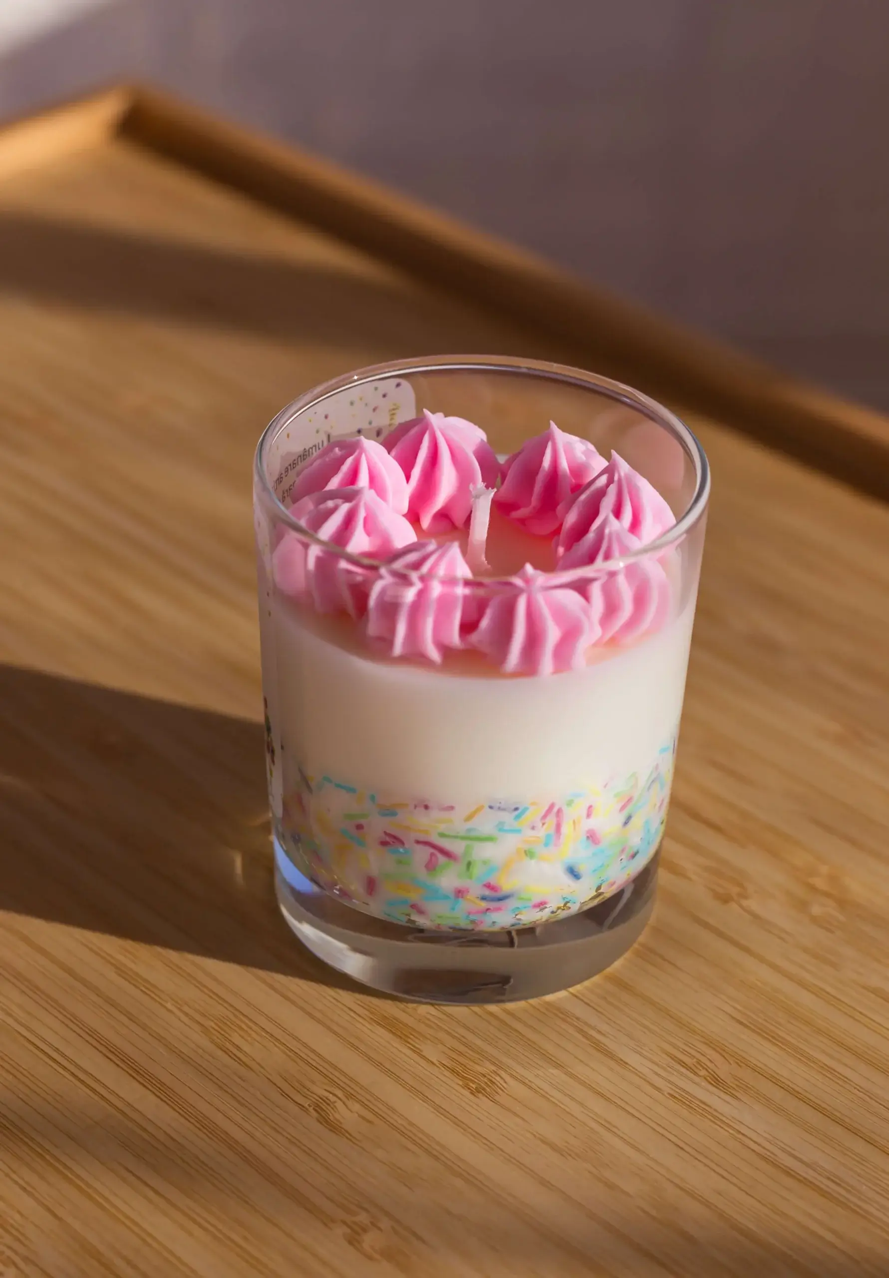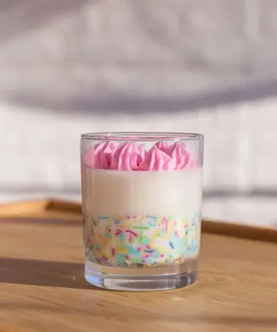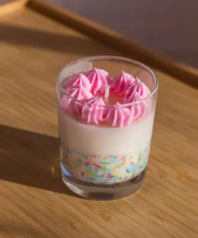 Concept și Design: concepută ca o alternativă inedită la cadourile clasice, lumânarea reproduce vizual un desert festiv. Partea superioară este realizată printr-o tehnică manuală de whipping (batere a cerii), obținând o textură aerată similară cu frișca, iar pe margini sunt aplicate manual elemente decorative (sprinkles) din ceară.